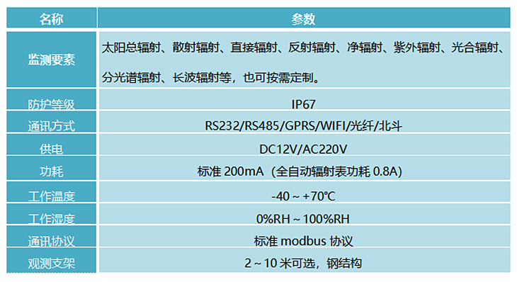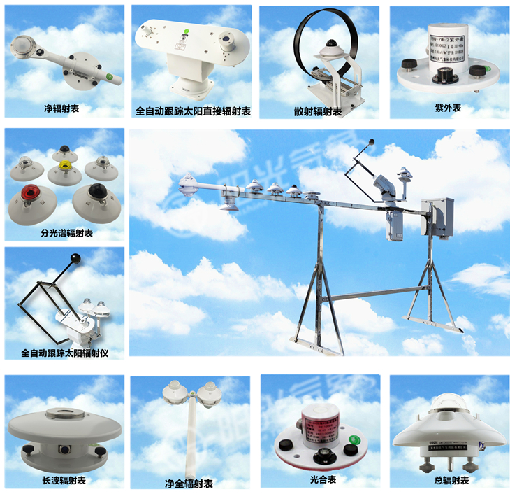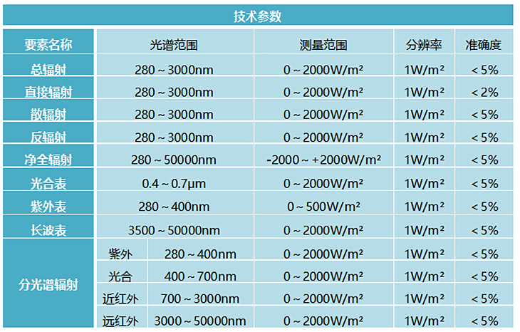 太陽輻射是氣象觀測指標中重要內(nèi)容,根據(jù)氣象組織WMO標準要求,太陽輻射標準觀測分為:總輻射、散射輻射、直接輻射、反射輻射、凈全輻射,太陽光譜輻射(紫外光、可見光,近紅外光,遠紅外光)