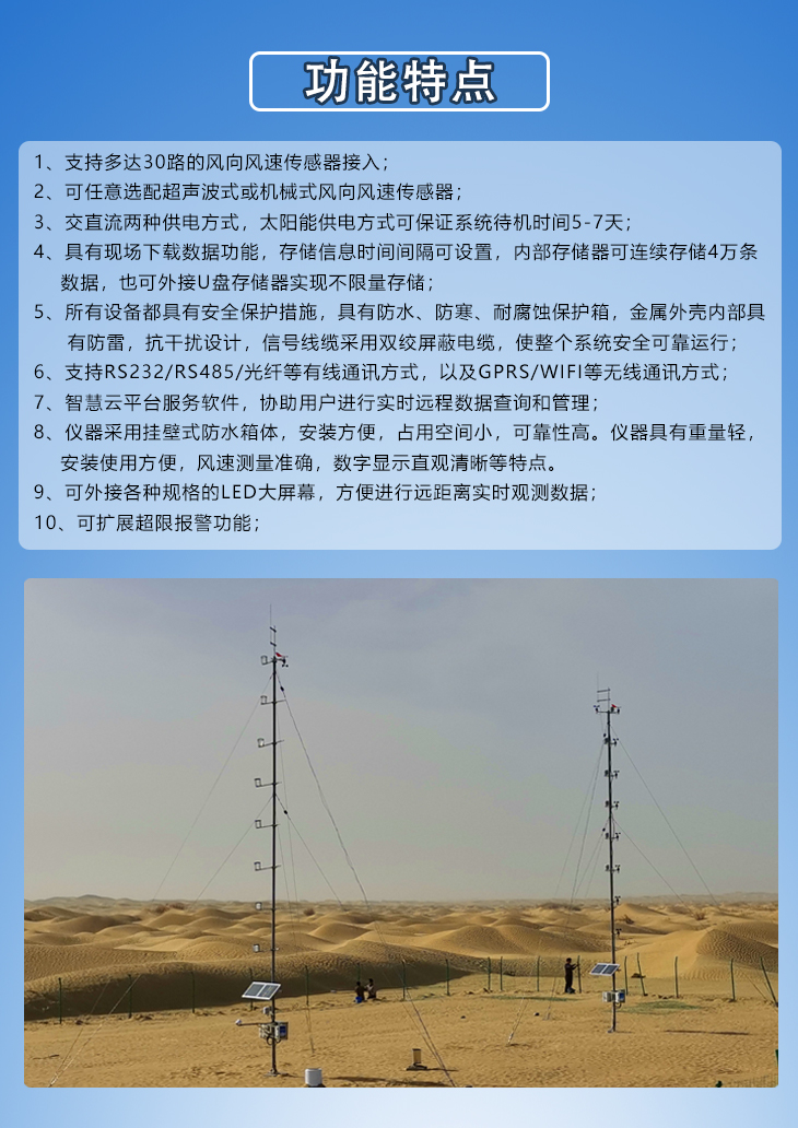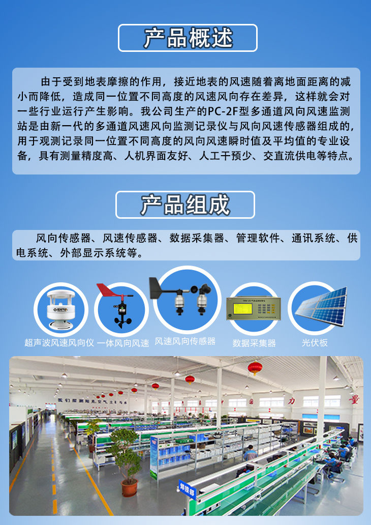 由于受到地表摩擦的作用,接近地表的風速隨著離地面距離的減小而降低,造成同一位置不同高度的風速風向存在差異,這樣就會對一些行業(yè)運行產(chǎn)生影響。我公司生產(chǎn)的PC-2F型多通道風向風速監(jiān)測站是由新一代的多通道風速風向監(jiān)測記錄儀與風向風速傳感器組成的,用于觀測記錄同一位置不同高度的風向風速瞬時值及平均值的專業(yè)設(shè)備,具有測量精度高、人機界面友好、人工干預(yù)少、交直流供電等特點。