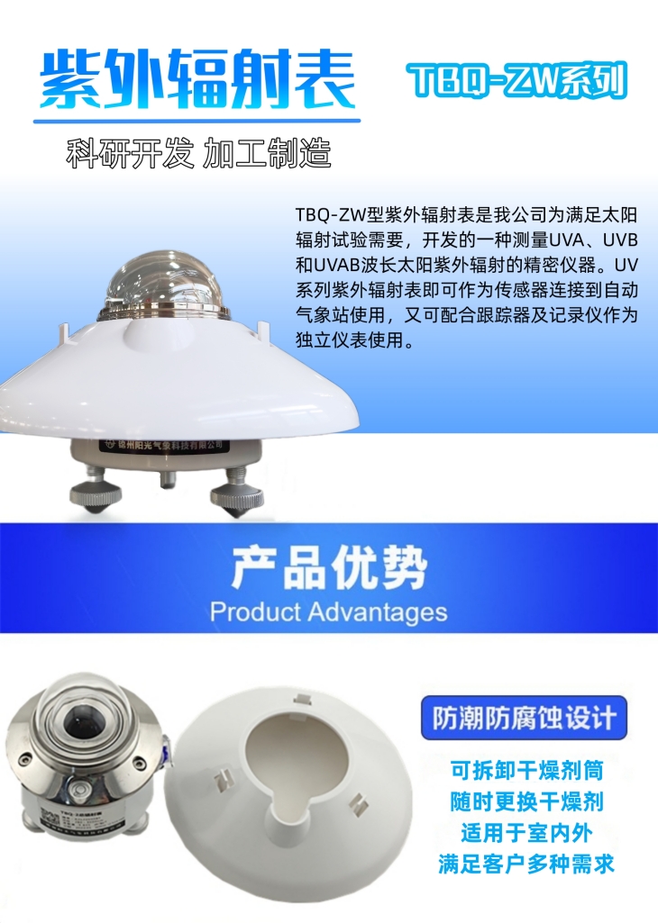 TBQ-ZW型紫外輻射表是我公司為滿足太陽輻射試驗(yàn)的需要,開發(fā)的一種測量UVA、UVB和UVAB波長太陽紫外輻射的精密儀器。UV系列紫外輻射表即可作為傳感器連接到自動氣象站使用,又可配合跟蹤器及記錄儀作為獨(dú)立儀表使用。