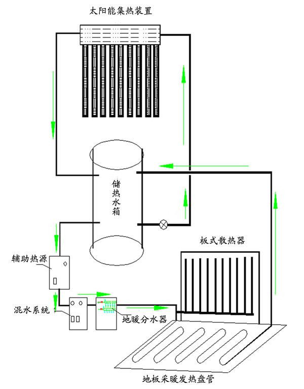 太陽能集熱器采集太陽的能量,把冷水逐漸加熱,儲(chǔ)存在保溫水箱內(nèi),待需要取暖時(shí)開啟加以利用,把水箱內(nèi)儲(chǔ)存的熱能通過地暖管路內(nèi)熱水的循環(huán)對(duì)室內(nèi)空間進(jìn)行釋放熱能,將室內(nèi)的冷空氣加熱,來提高室內(nèi)空間的環(huán)境溫度。滿足需要。太陽能采暖系統(tǒng)由太陽能集熱器(平板太陽能集熱器、真空管太陽能集熱器、U型管太陽能集熱器、熱管太陽能集熱器)、水箱、連接管道、控制系統(tǒng)等輔材構(gòu)成。將分散的太陽能通過集熱器,把太陽能轉(zhuǎn)換成熱水,將熱水儲(chǔ)存在水箱內(nèi),然后通過熱水輸送到地暖管路,提供建筑供熱的需求。