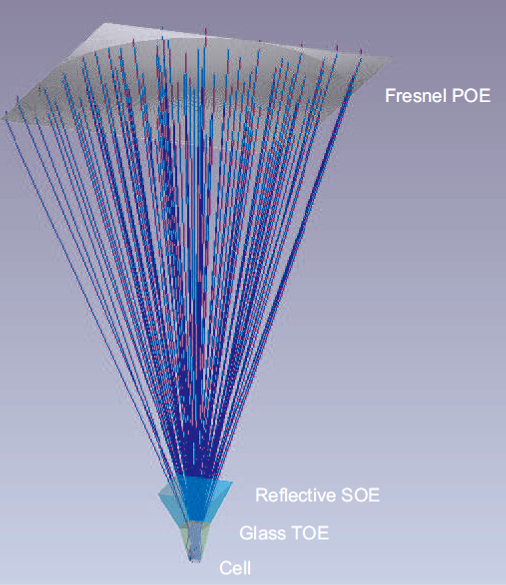 聚光光路設計中,入射光通過三級聚光部件進行聚光。其中初級光學器件(菲涅爾非成像玻璃透鏡)裝配到組件框架結構上,二三級光學器件裝配到聚光接收器模塊上。這種設計將入射接收角提高至±0.86°,同時提高光線均勻度。有效的提高了功率和效率。該光學器件及光路解決方案由德國知名光學設計公司提供。