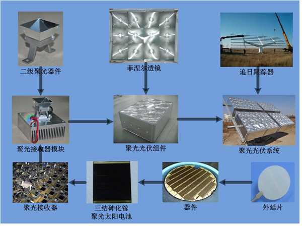 聚光光伏組件技術融合多結砷化鎵太陽電池外延技術和菲涅爾高倍聚光光學設計,創(chuàng)造出在1000倍光強下,轉換效率高達27%的IEC記錄,為聚光光伏領域創(chuàng)造了一個新的基準。