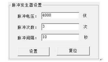 設(shè)置:設(shè)置完成后,點擊"設(shè)置"按鈕,系統(tǒng)將保存測試參數(shù),同時發(fā)送給脈沖發(fā)生器,此時脈沖發(fā)生器的顯示屏上將會顯示當(dāng)前設(shè)置的脈沖電壓