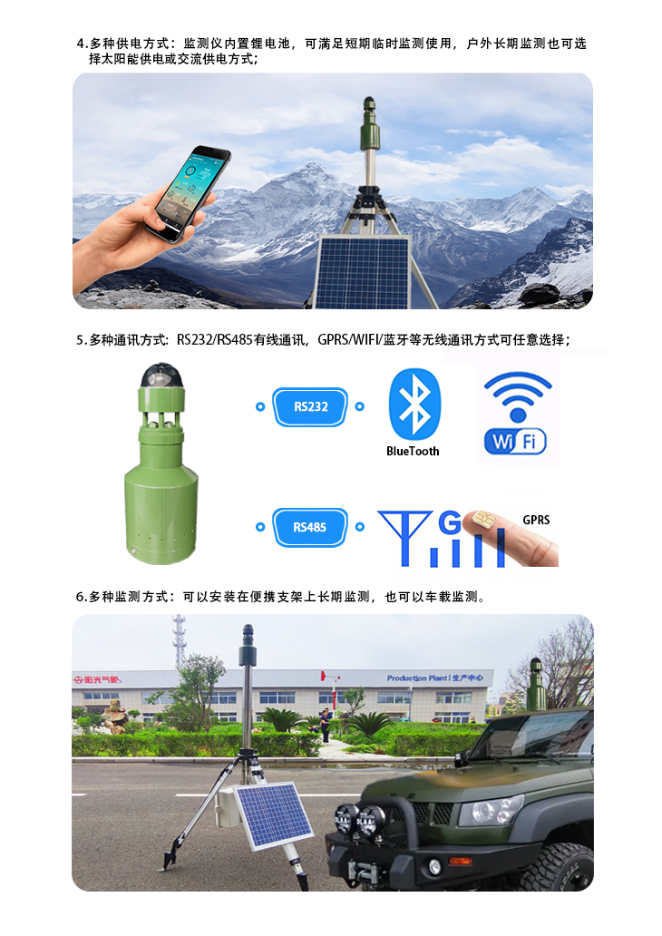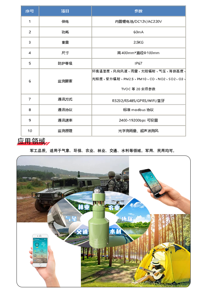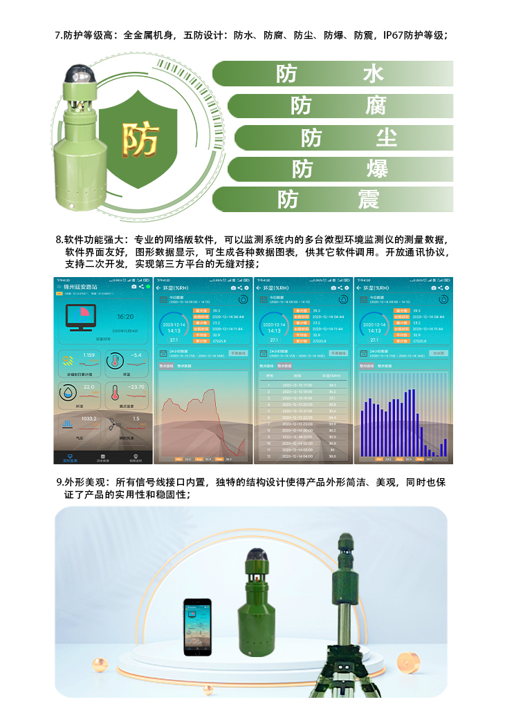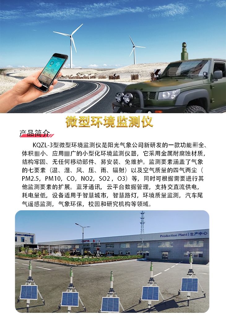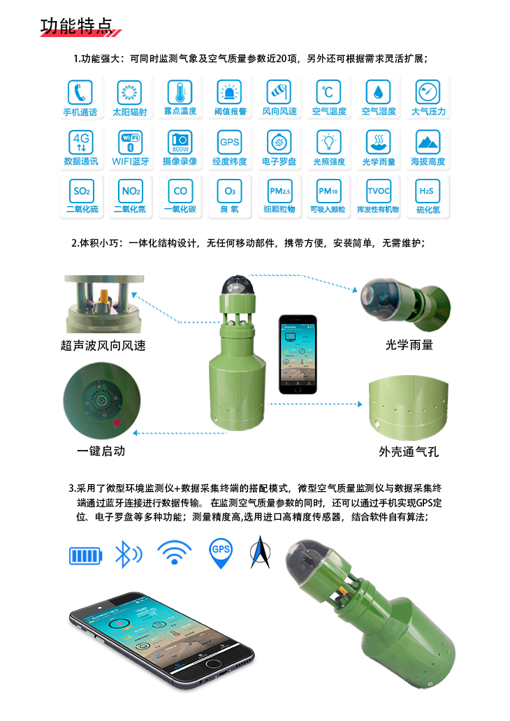 KQZL-3型微型環(huán)境監(jiān)測儀是陽光氣象公司新研發(fā)的一款功能全、體積小、應(yīng)用廣的小型化環(huán)境監(jiān)測儀器,它采用金屬耐腐蝕材質(zhì),結(jié)構(gòu)牢固、無任何移動部件、易安裝、免維護(hù)。監(jiān)測要素涵蓋了氣象的七要素(溫、濕、風(fēng)、壓、雨、輻射)以及空氣質(zhì)量的四氣兩塵(PM2.5,PM10,CO,NO2,SO2 ,O3)等,同時(shí)可根據(jù)需要進(jìn)行其他監(jiān)測要素的擴(kuò)展。藍(lán)牙通訊,云平臺數(shù)據(jù)管理,支持交直流供電,耗電量低,設(shè)備適用于智慧城市,智慧路燈,環(huán)境質(zhì)量監(jiān)測,汽車尾氣遙感監(jiān)測,氣象環(huán)保,校園和研究機(jī)構(gòu)等領(lǐng)域。