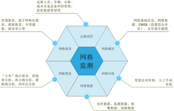 網(wǎng)格監(jiān)測(cè)對(duì)應(yīng)于水環(huán)境監(jiān)測(cè)、管理的常規(guī)業(yè)務(wù)應(yīng)用,主要包括各級(jí)監(jiān)測(cè)網(wǎng)格的:網(wǎng)格概況、網(wǎng)格審核、網(wǎng)格數(shù)據(jù)、網(wǎng)格圖表、網(wǎng)格報(bào)表及運(yùn)維質(zhì)控等6個(gè)功能模塊,實(shí)現(xiàn)對(duì)常規(guī)性的跨界、飲用水源地、生態(tài)補(bǔ)償考核斷面的常規(guī)站、浮標(biāo)站的全面管理、管控,并可輸出標(biāo)準(zhǔn)、規(guī)范的報(bào)表、圖表、報(bào)告等文本資料。