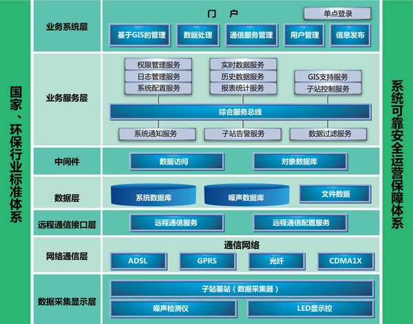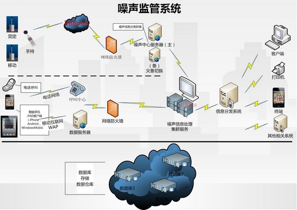 噪聲監(jiān)管系統(tǒng)的目標是將噪聲污染源的狀態(tài)利用傳感技術、通訊技術、計算機及其網(wǎng)絡技術、GIS技術、信息業(yè)務處理系統(tǒng)有機結合而構成的新型環(huán)境噪聲監(jiān)測和管理系統(tǒng)。系統(tǒng)將以GIS技術和信息業(yè)務處理系統(tǒng)為核心,利用在線監(jiān)測終端設備(通訊方式可選擇ADSL/LAN/CDMA/GPRS/3g),把相關噪聲數(shù)據(jù)傳送到服務器。服務器端可由基于ORACLE的數(shù)據(jù)庫和基于.NET架構開發(fā)的服務端軟件組成。采用C/S與b/s結合多客戶分布式的城市噪聲監(jiān)管信息化系統(tǒng)方式,實現(xiàn)對噪聲跟蹤監(jiān)測,并根據(jù)遠程返回的數(shù)據(jù),安排執(zhí)法工作人員對出現(xiàn)的噪聲參數(shù)超標等不正常情況及時做出相應的處理,并根據(jù)噪聲的歷史數(shù)據(jù),為管理部門決策提供相關支持。
