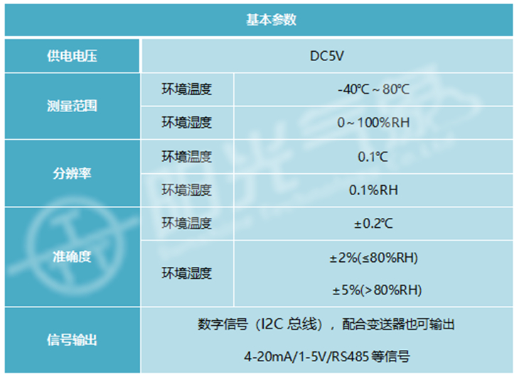 4、數(shù)字信號(hào)輸出,I2C總線與微控制器進(jìn)行通信,能輸出數(shù)字式溫濕度數(shù)據(jù)。