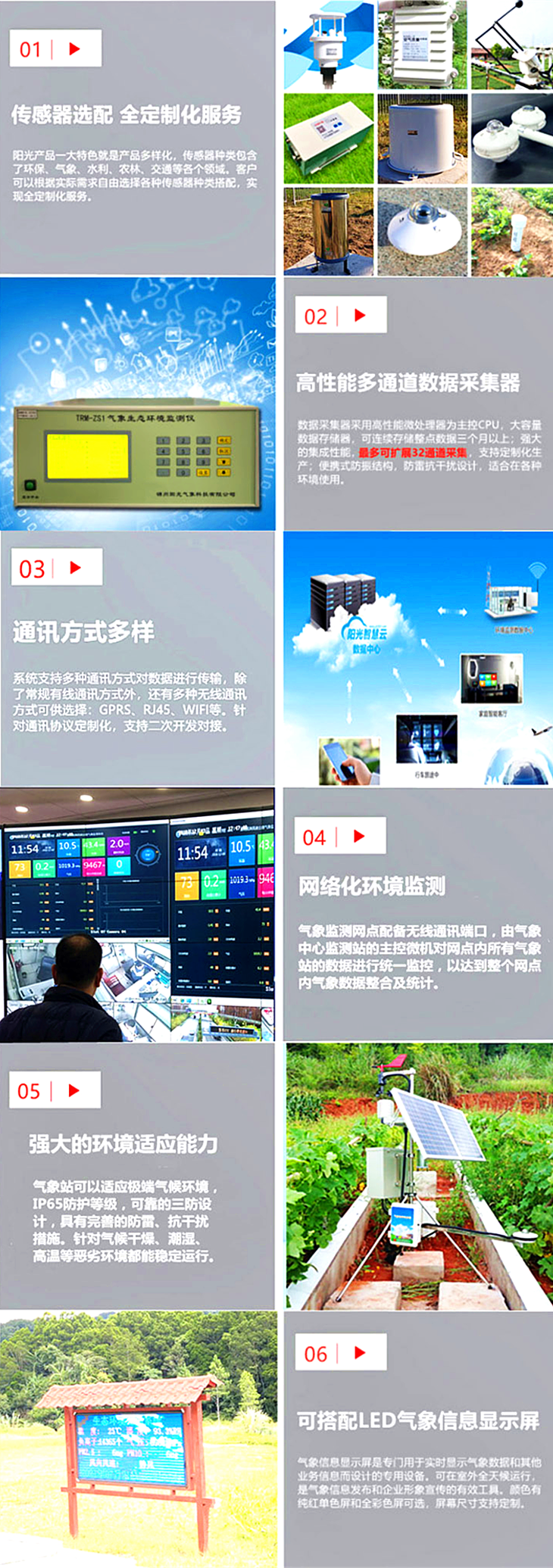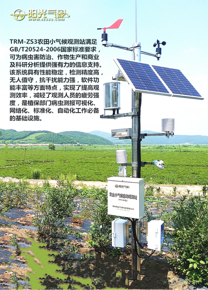 TRM-ZS3農(nóng)田小氣候觀測站滿足GB/T 20524-2006國家標(biāo)準(zhǔn)要求,可為病蟲害防治、作物生產(chǎn)和商業(yè)及科研分析提供強(qiáng)有力的信息支持。該系統(tǒng)具有性能穩(wěn)定,檢測精度高,無人職守,抗干擾能力強(qiáng),軟件功能豐富等方面特點(diǎn)。