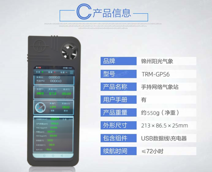 TRM-GPS6型手持氣象站是我公司研發(fā)的第四代便攜式自動(dòng)氣象站。主要用于便攜條件下實(shí)施氣象觀測(cè)。它具有測(cè)量精度高、穩(wěn)定可靠、體積小、重量輕、攜帶方便、可直接手持觀測(cè)等突出優(yōu)點(diǎn)。系統(tǒng)能自動(dòng)測(cè)量環(huán)境溫度、濕度、露點(diǎn)、風(fēng)速、風(fēng)向、輻射、空氣質(zhì)量、PM2.5、PM10、甲醛、大氣壓力、海拔和當(dāng)前經(jīng)緯度等氣象要素。