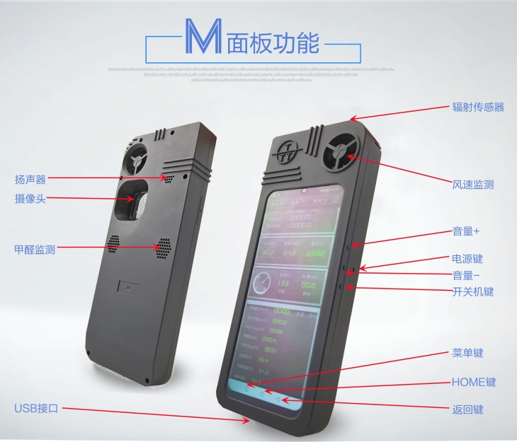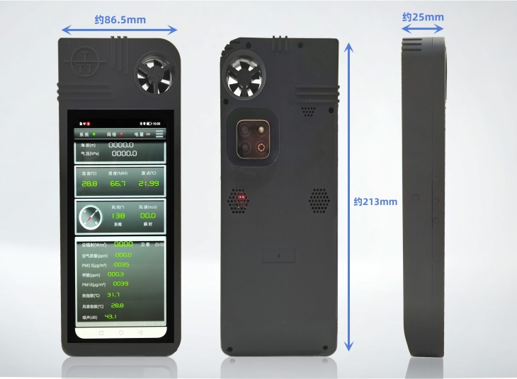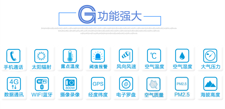測(cè)量要素為:風(fēng)速,風(fēng)向,環(huán)境溫度,環(huán)境濕度,氣壓,太陽(yáng)輻射,風(fēng)寒指數(shù),熱指數(shù),露點(diǎn),海拔高度,位置經(jīng)度緯度,電子羅盤,時(shí)間,空氣質(zhì)量、PM2.5、PM10、甲醛、照拍/錄像 , 手機(jī)通話功能 , GPRS無(wú)線數(shù)據(jù)網(wǎng)絡(luò),數(shù)據(jù)云平臺(tái)。