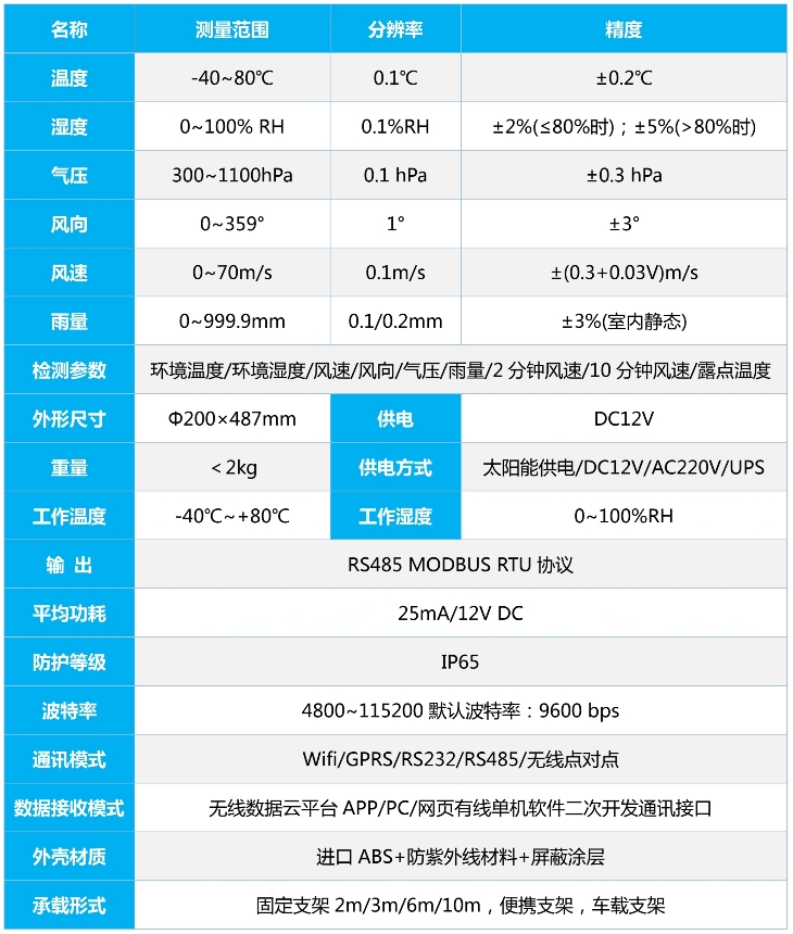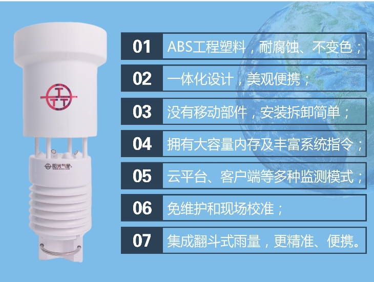 PC-8K型氣象六參數(shù)環(huán)境監(jiān)測(cè)儀是我公司自主研制的一款測(cè)量多種氣象要素的專業(yè)級(jí)一體化氣象站,可同時(shí)測(cè)量大氣溫度、大氣濕度、風(fēng)速、風(fēng)向、氣壓、雨量等主要?dú)庀笠?。其中雨量為高精度翻斗式雨量傳感器,其特點(diǎn)是精度高,響應(yīng)速度快,串口輸出,方便用戶直接通過(guò)PC或外接儀器進(jìn)行采集。