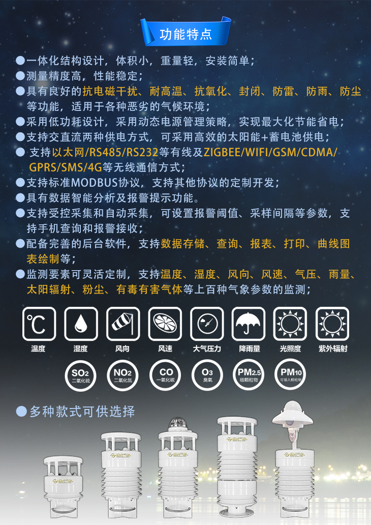 智慧路燈桿作為一個很好的載體,智慧燈桿配備的氣象檢測可以24小時實時在線連續(xù)采集監(jiān)測環(huán)境及氣象數(shù)據(jù),包括PM2.5,溫度、濕度、氣壓、風(fēng)向、風(fēng)速、風(fēng)力、噪音等等,并可在信息屏上實時顯示。系統(tǒng)提供的統(tǒng)計分析功能,還可分析出一段時間,如一個月、半年等維度的空氣質(zhì)量整體情況,輸出統(tǒng)計報告等。