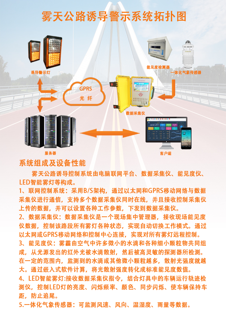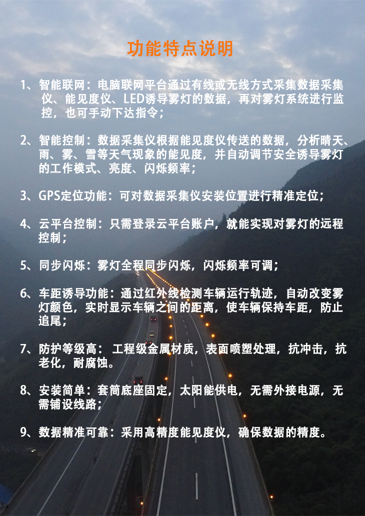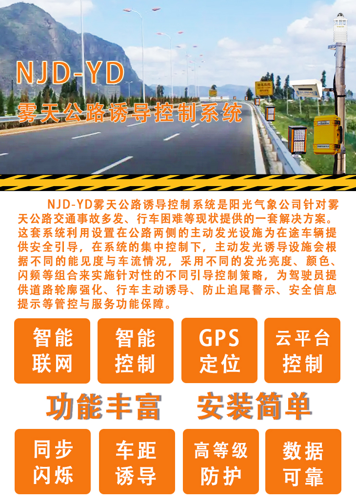 NJD-YD霧天公路誘導(dǎo)控制系統(tǒng)是陽光氣象公司針對霧天公路交通事故多發(fā)、行車?yán)щy等現(xiàn)狀提供的一套解決方案。