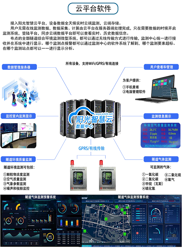 隨著隧道開挖的深入,一些隧道會出現(xiàn)有毒有害氣體和粉塵,如甲烷、一氧化碳、硫化氫、PM10等氣體和顆粒物。為加強(qiáng)隧道施工人員的安全管理,防止在隧道施工工程中氣體和粉塵超限帶來危險(xiǎn),確保人員、機(jī)具和工程安全,做好監(jiān)測預(yù)防工作,部署隧道氣體監(jiān)測系統(tǒng)是非常有必要的。本系統(tǒng)以《隧道安全規(guī)程》、《公路隧道施工規(guī)范》以及《作業(yè)場所空氣中粉塵濃度測定方法》為主要依據(jù),并根據(jù)上述“規(guī)程、規(guī)范”要求進(jìn)行有毒有害氣體監(jiān)測、預(yù)防和控制。根據(jù)有害氣體的含量高低、濃度大小,采取相應(yīng)的技術(shù)措施,根據(jù)隧道有毒有害氣體的實(shí)際情況,將甲烷(瓦斯)(CH4)、一氧化碳(CO)、二氧化碳(CO2)、氧氣(O2)、粉塵(PM2.5+PM10)作為主要監(jiān)測對象,把一些含量低、濃度小的有害氣體作為輔助監(jiān)控對象。隧道氣體監(jiān)測預(yù)警系統(tǒng)通過傳感器采集施工現(xiàn)場狀況,經(jīng)過數(shù)據(jù)處理分析傳入后臺,可顯示現(xiàn)場環(huán)境監(jiān)測指數(shù),對于超過臨界值的數(shù)據(jù)進(jìn)行報(bào)警。此外,借助視頻監(jiān)控對隧道內(nèi)情況進(jìn)行監(jiān)控,防止人員進(jìn)入。