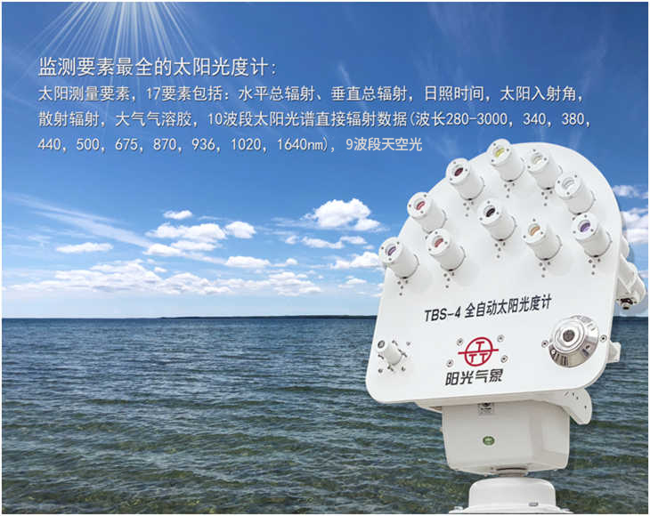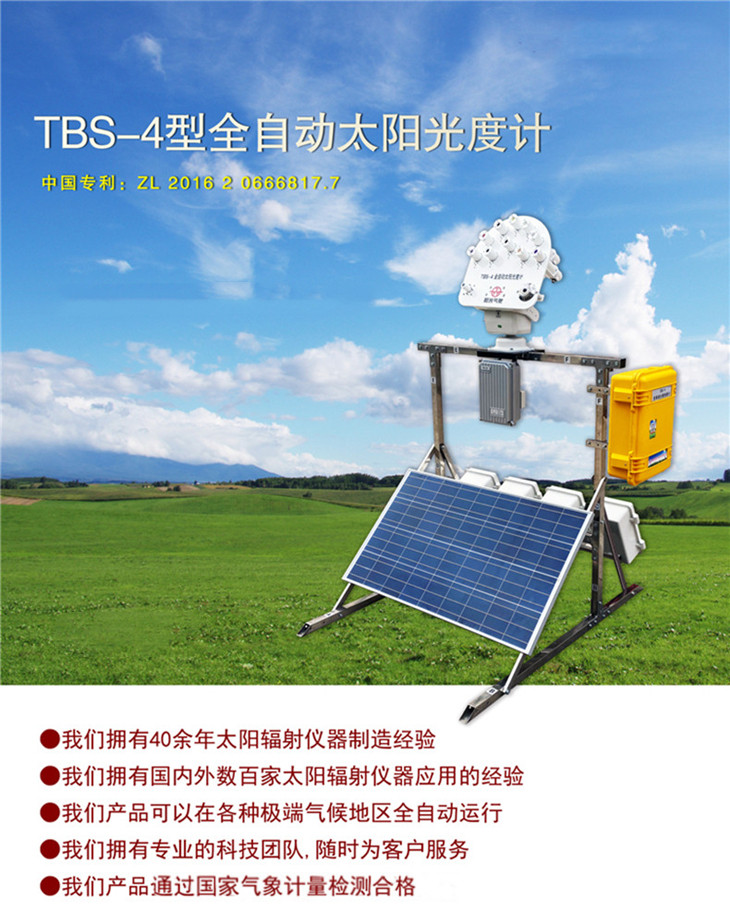 TBS-4全自動太陽光度計為高精度野外太陽和天空輻射測量儀器,不但可以測量十個波段的太陽直接輻射,還可以測量太陽的總輻射、散射輻射、日照時數(shù)、太陽高度角、大氣氣溶膠厚度等諸多要素,并可以通過GPS實時定位追蹤。還具有易攜帶安裝,自動瞄準,太陽能供電,無線組網(wǎng)云端監(jiān)測,數(shù)據(jù)自動傳輸?shù)忍攸c。它將機器人控制技術(shù)與輻射測量技術(shù)完美結(jié)合,采用了太陽光追蹤+旋轉(zhuǎn)角度測量+輻射光譜測量+GPS 衛(wèi)星定位追蹤等綜合應(yīng)用技術(shù)。它是當今應(yīng)用廣、功能全、權(quán)威性高的太陽光度計儀器。主要用于測量太陽和天空在可見光和近紅外的不同波段、不同方向、不同時間的輻射亮度,來推算大氣氣溶膠、水汽、臭氧等成分的特性。用于大氣環(huán)境監(jiān)測,衛(wèi)星校正等應(yīng)用。