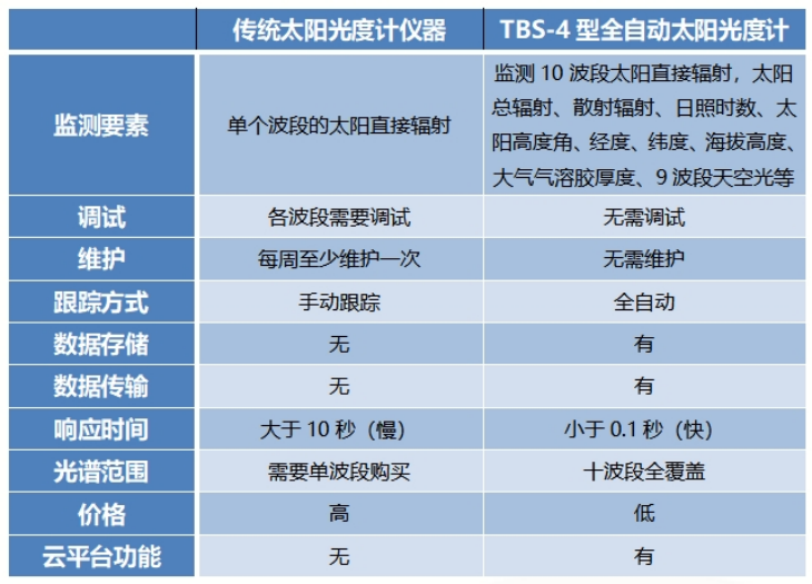 1、采用了同步測量技術(shù),除了可以同時監(jiān)測10個波段的直接輻射外,還可以監(jiān)測同一時刻太陽的總輻射、散射輻射、日照時數(shù)、太陽高度角、9個波段天空光等要素。它解決了國外同類儀器分時測量存在時間誤差的問題,這種測量模式會大大提高太陽的光譜分析精度;