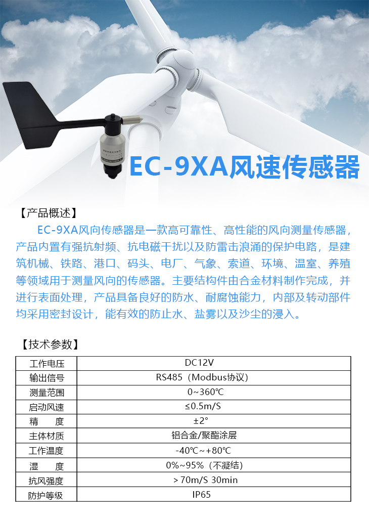EC-9XA風(fēng)向傳感器是一款高可靠性、高性能的風(fēng)向測(cè)量傳感器,產(chǎn)品內(nèi)置有強(qiáng)抗射頻、抗電磁干擾以及防雷擊浪涌的保護(hù)電路,是建筑機(jī)械、鐵路、港口、碼頭、電廠、氣象、索道、環(huán)境、溫室、養(yǎng)殖等領(lǐng)域用于測(cè)量風(fēng)向的傳感器。主要結(jié)構(gòu)件由合金材料制作完成,并進(jìn)行表面處理,產(chǎn)品具備良好的防水、耐腐蝕能力,內(nèi)部及轉(zhuǎn)動(dòng)部件均采用密封設(shè)計(jì),能有效的防止水、鹽霧以及沙塵的浸入。