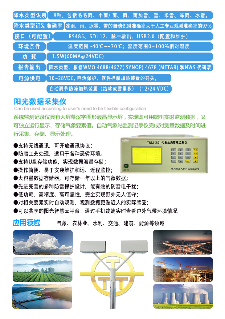 YWDP-2型天氣現(xiàn)象儀是錦州陽光自主研發(fā)的國產(chǎn)化高精降雨探測設(shè)備,可以識(shí)別各種雨及雪的狀態(tài),滿足對(duì)雨雪的精密觀測,其采用高精度激光技術(shù),實(shí)現(xiàn)對(duì)降雨.降雪及冰雹的高精度探測。產(chǎn)品按照國際氣象WMO組織氣象觀測標(biāo)準(zhǔn)設(shè)計(jì)、生產(chǎn)的標(biāo)準(zhǔn)產(chǎn)品, 具有性能穩(wěn)定,檢測精度高,無人值守等特點(diǎn),可滿足專業(yè)氣象觀測的業(yè)務(wù)要求??蓽y量的降水類型如下:毛毛雨、陣雨、雨、雨夾雪、雪、雪粒、凍雨、冰雹等所有的天氣現(xiàn)象指標(biāo)。